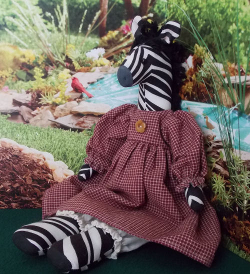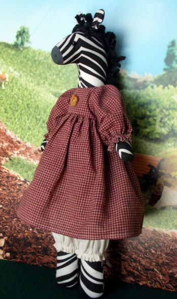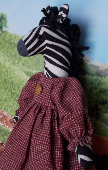 This is Miss Zebra. She is about 14 inches tall. She was made from a vintage Simplicity pattern. The Zebra and her clothes were all made by me.