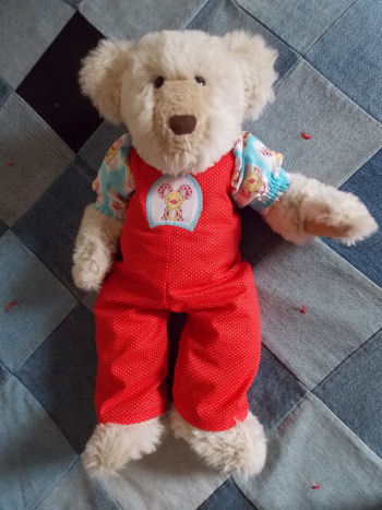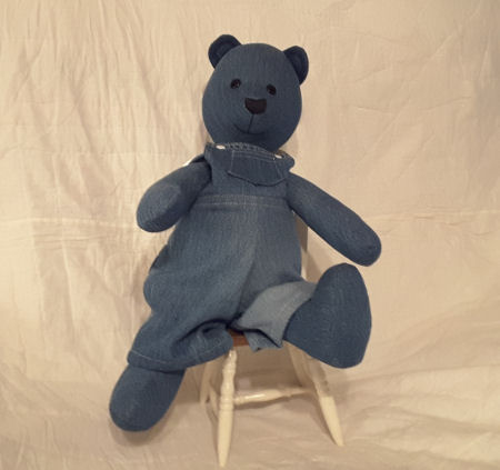 The overalls that the bear is wearing were made using my own pattern and using the fabric from the same overalls.