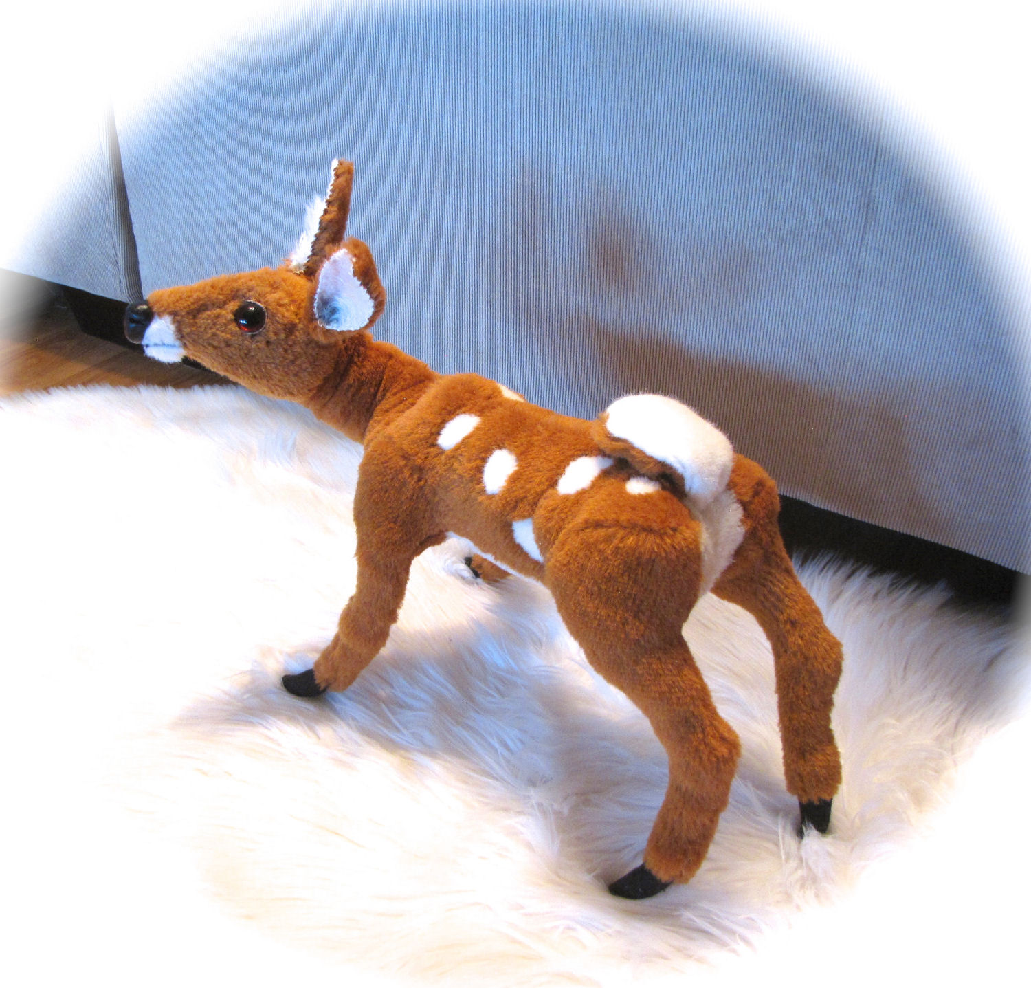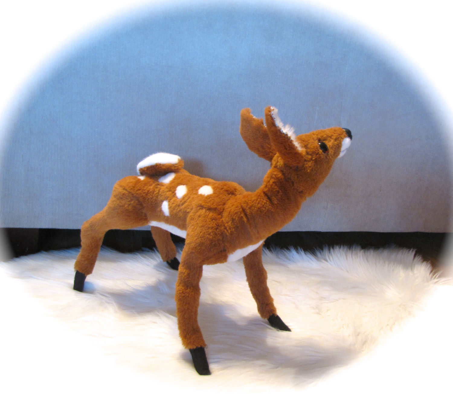 I made the Fawn from a pattern by Furry Critters it is made from Alpaca and has a loc line armature and a sculpted nose glass eyes and leather eyelids with eyelashes.