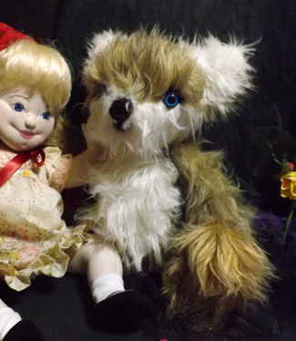 I'm made of a mottled kind of fabric,, and some fake fur, paint, and all kinds of embellishment.. I do stand alone.. but I"m still a little clumsy.. so my standy helps me.