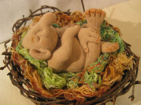 The bird's nest is woven from fresh-cut long twigs from Hanging Birch trees, into an irregular basket. The soft bedding is thread reclaimed from washing quilt cloth pieces.