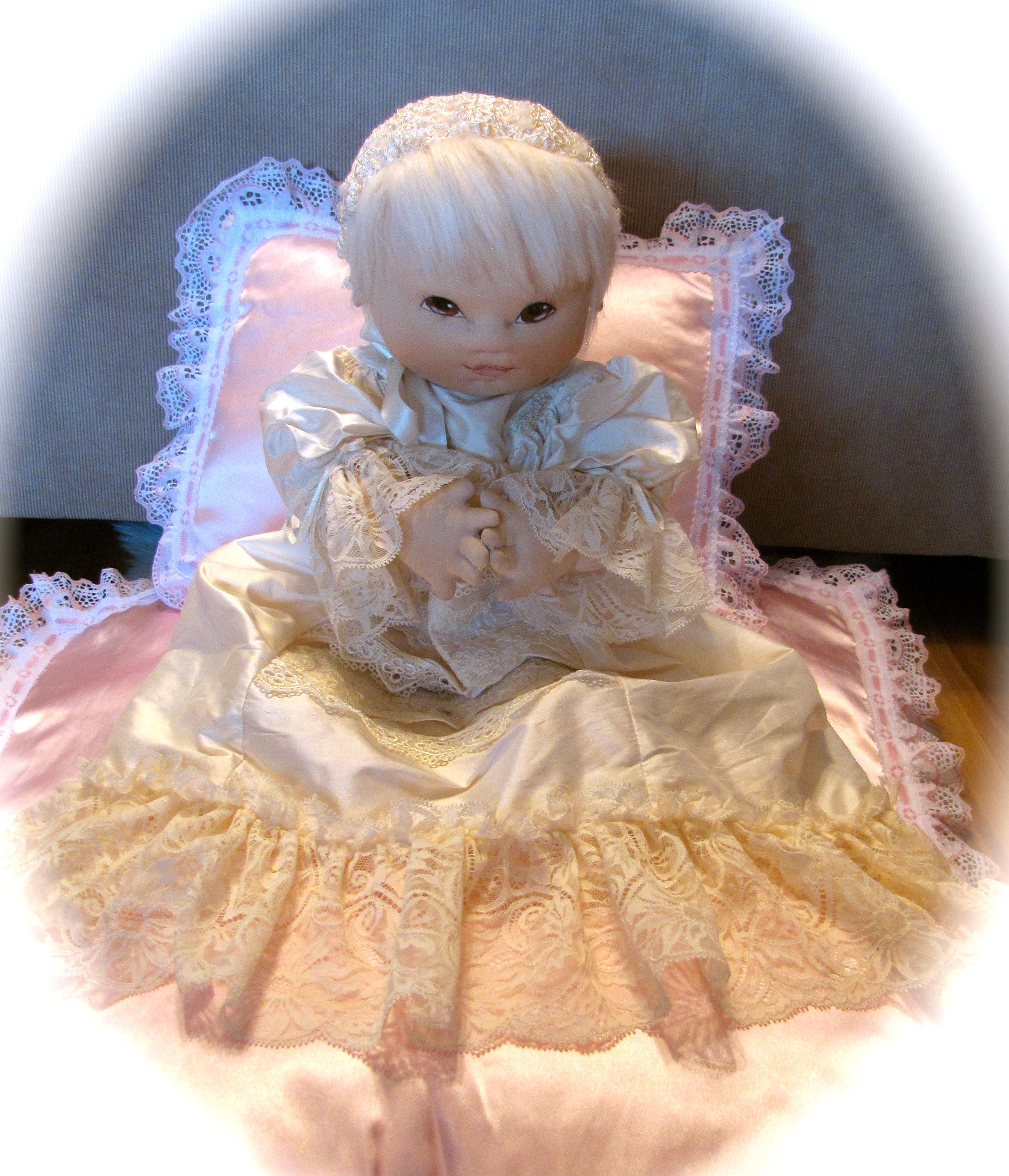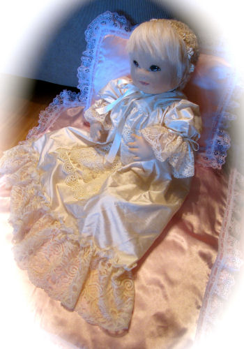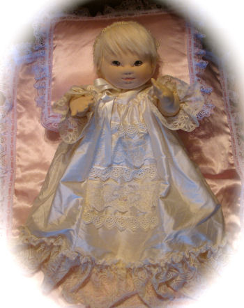 her face is sculpted and then painted. The outfit I made from a Doll Emporium pattern. I also made the bedding but I