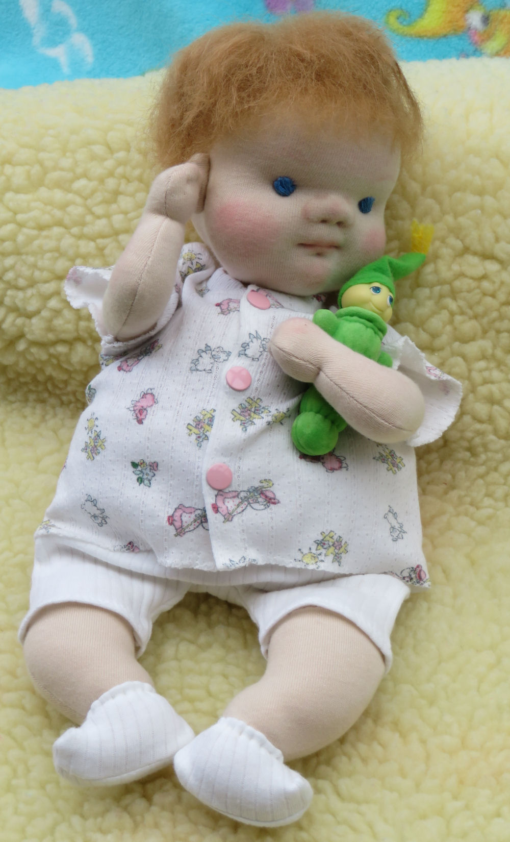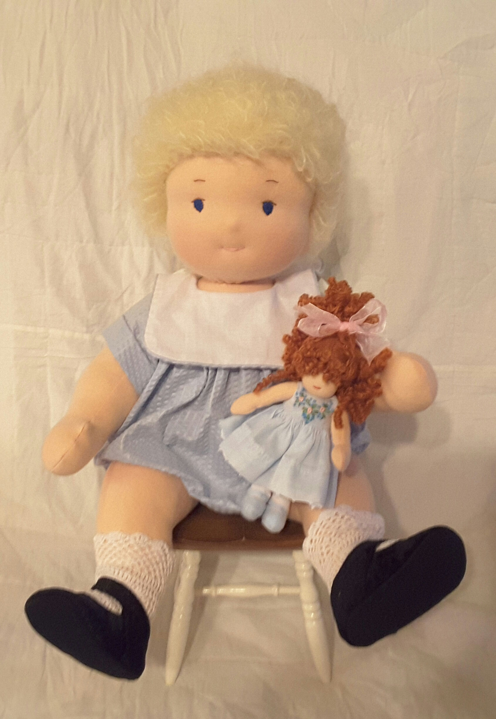 In her arms a mini Waldorf type doll made for her, wearing a tiny heirloom dress from a pattern by scientific seamstress.