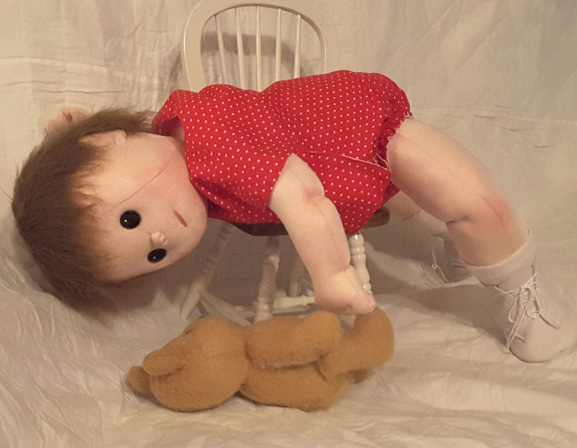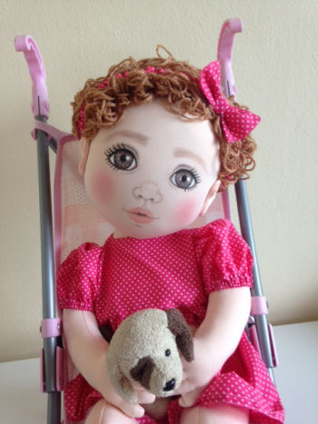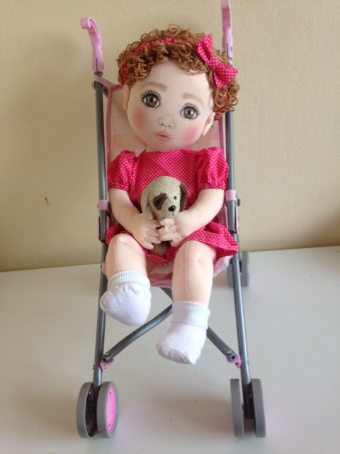 Annabel is 23" long. The curly hair was achieved by wrapping knitting Yarn around wooden dowelling, immersing it in boiling water & then baking in the oven for 1 hour at a low temperature. The "hair" is unwrapped when cool & forms ringlets. This was then hand sewn & glued to her head. Her face is painted on freehand with fabric paint & fineliners & blusher. Annabels dress & hairband are my own design & made from Polycotton. She has purchased baby socks & disposable nappy & her toy dog & baby buggy are also purchased. I hope you like her?