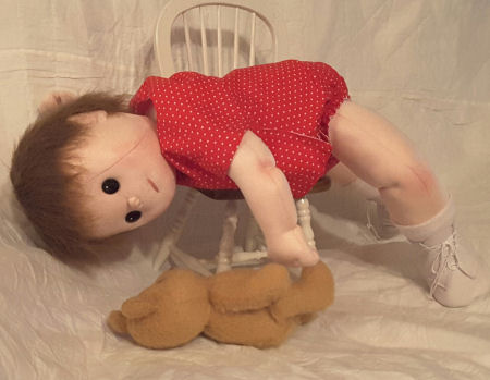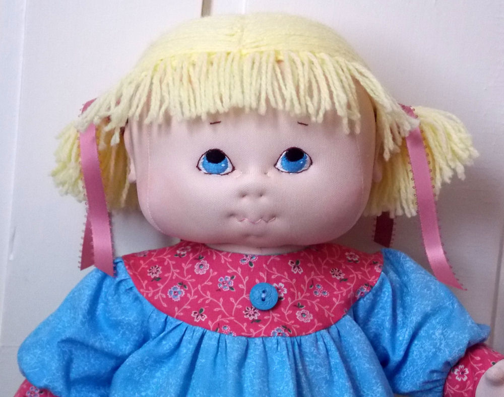 This is Annabel & she is 10 months old. I used flesh coloured stretch scuba fabric for Annabel's body & head. I used my old faithful Judi Ward pattern for a basic doll for the body but enlarged it. The head is of my own design.