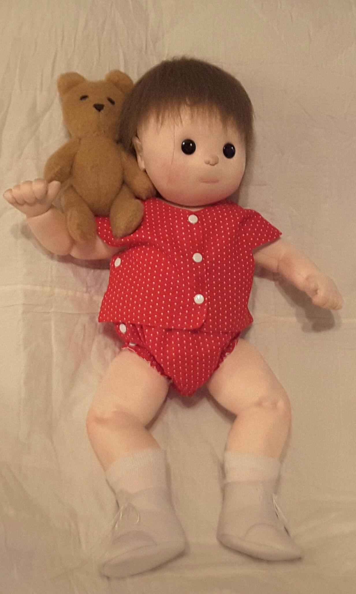 His outfit was made by scaling down a one piece outfit from a book called Beautiful Things to Make for Baby by Sunset. Outfit is made of red with white dots cotton and lined with white batiste, it is closed with white snaps. The outfit is a one piece on the front and two pieces in the front.