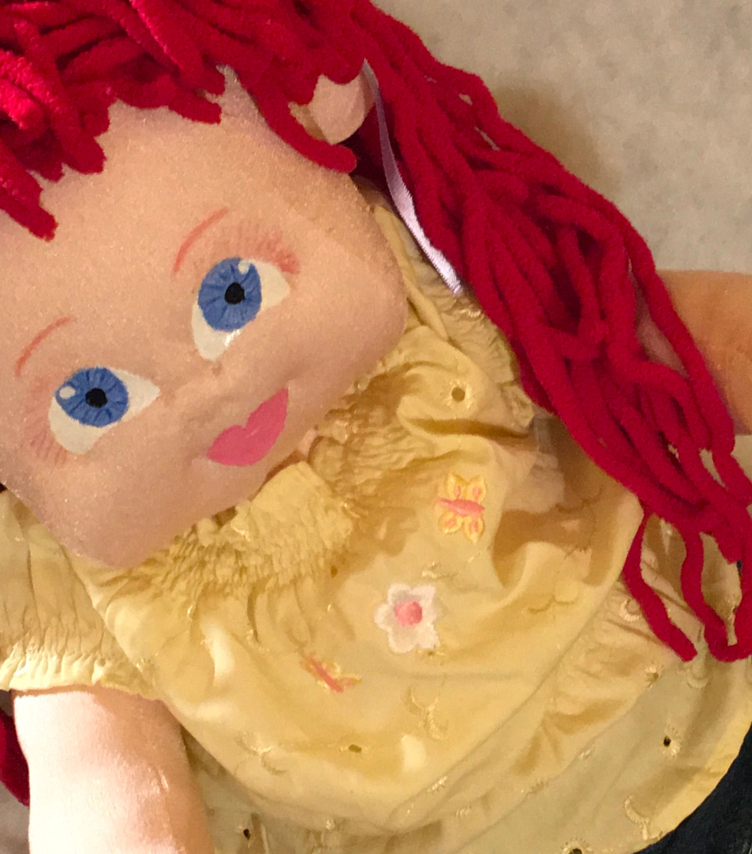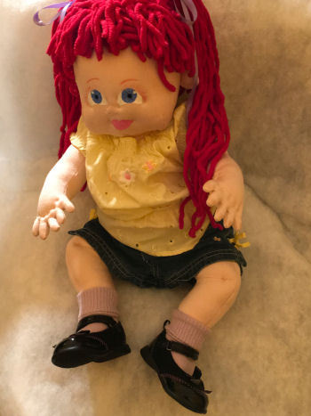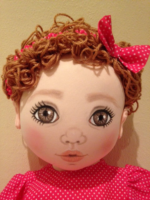 The wig was crocheted using mohair yarn in a curly style. Eyes were embroidered in blue. She was blushed to give her a healthy blush.