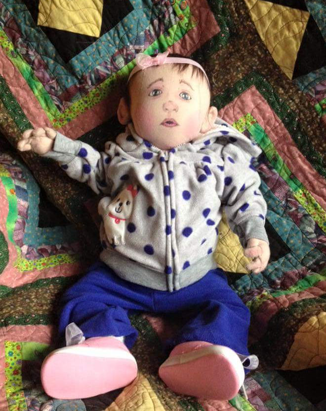 Rebecca has a cute and chubby build. Her hands, feet, tummy, and bottom is needle sculpted. She can sit all by herself like a six month old baby. Her face is hand painted with more needle sculpture to highlight her face. An artist pencils was used for the eyebrows and eyelashes. The pigtails are made up of yarn that has been hand seen one strand at a time. Finally her outfit and shoes are brought babies clothes and shoes discount store.