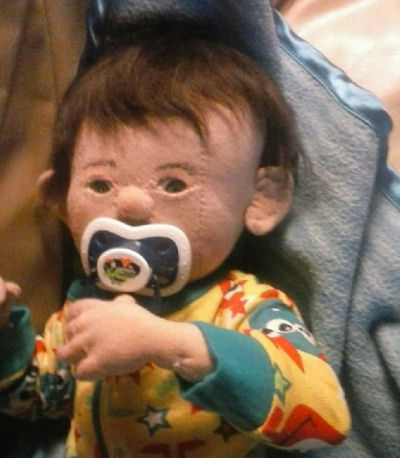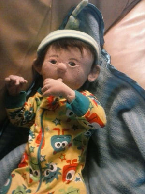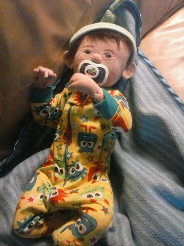 This my little preemie, his name is Gavin, he is only 14 inches long. He has a doe suede body that has been stuffed and weighted. He weights about 4 lbs, and he has flexible fingers, arms, and legs. He has inserted baby blue eyes, and a mouth made to take a Pacifier. His hair is a baby soft mohair wig to give him a more realistic look. He's wearing a preemie outfit. PS. He can even suck his thumb.