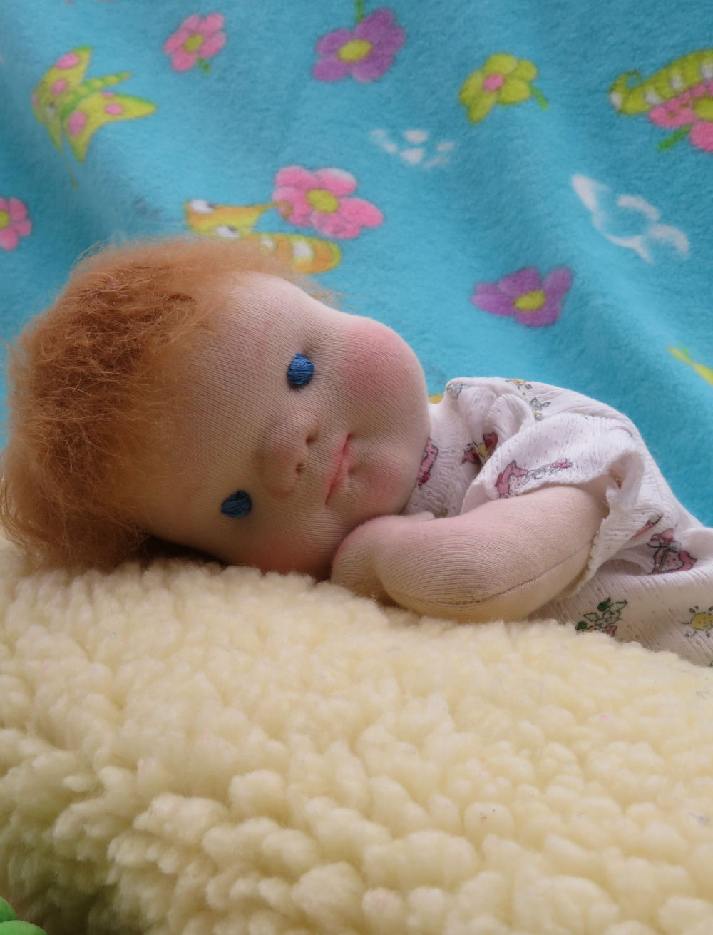 Lil-One's head is made in the classic Waldorf style using sheep's wool. The facial features (cheeks, nose, chin and lips) are needle felted and finally, the cotton knit 'skin' is pulled over the head. Her hair is a little rectangle of Icelandic sheep's wool trimmed to suit the face.