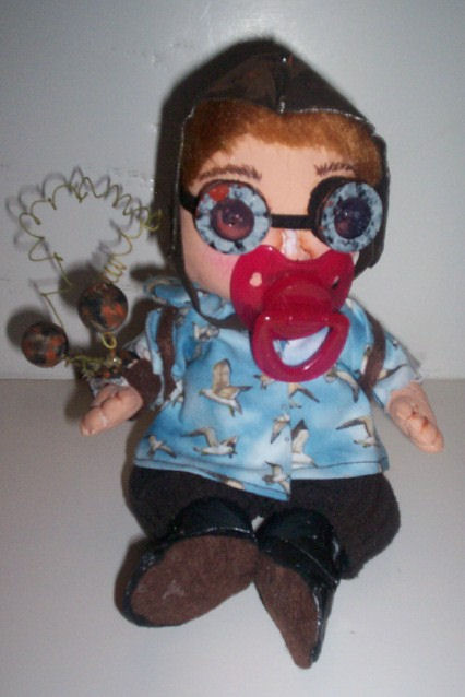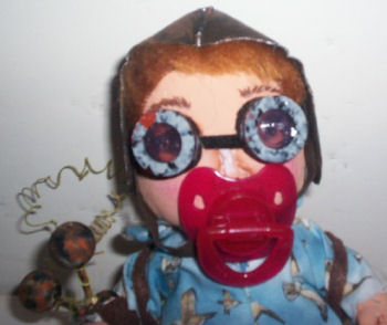 My name is Avy. I'm a girl I think. I'm an adaptation from an original design by Susan Barmore ( AKA "Frowning Francis" ) I'm 8 inches tall, small for my age. I was tired of my pacifier so when mommy wasn't looking I got into her stash. Oh what fun... washer here, felt there, paint under there, some Tyvek there, and some here. Oh oh... Mommy caught me. But she's NOT mad. She sat me in a pose, took a picture. and used me for her Steampunk Baby model.