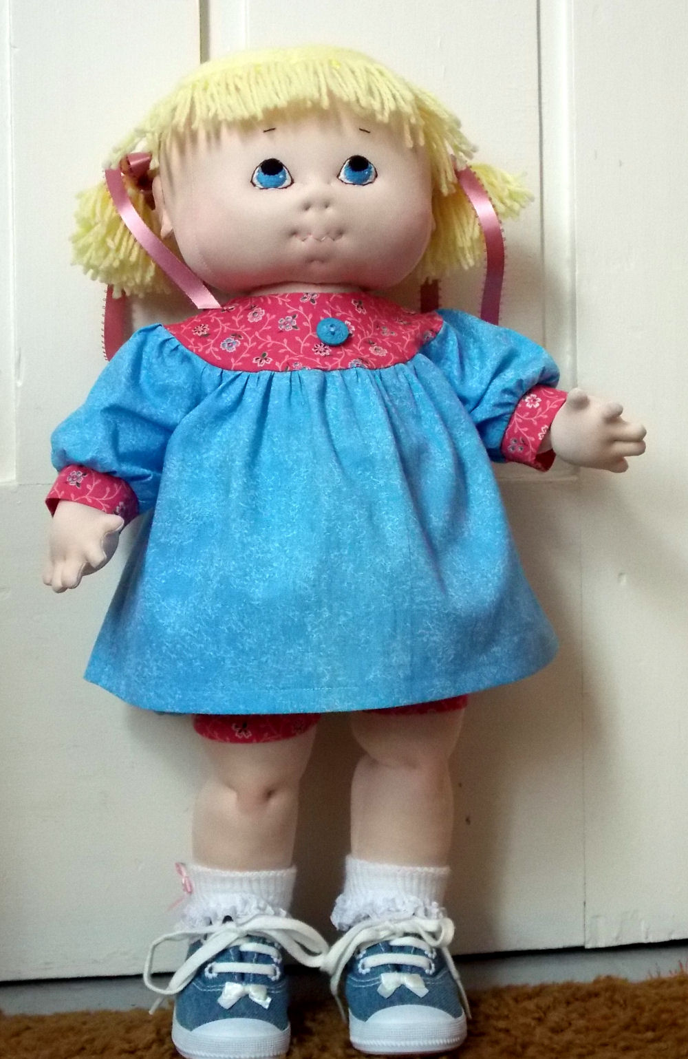 A bubble suit was made for Sweet Cheeks using a waffle weave fabric in light blue and white linen for the collar , the outfit was homemade, the pattern made for this doll a copy of a real baby suit. She also is wearing hand crocheted socks and real baby shoes.