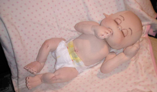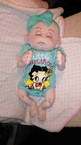 A preemie made from the Judi Ward's preemie baby pattern. She has jointed arms and legs. She loves cuddles and love, they will help her grow bigger and stronger. She is wearing a newborn onsie with sweet little betty Boop on it. She has no hair but she can still wear a big sweet bow to make her look as girly as she is. She is anatomically correct. She is so little, only 15 inches long. She still sleeps a lot to help her grow.