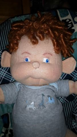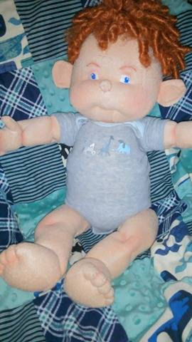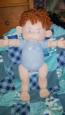 Charlie is a big boy made from the Judi Wards 6 To 9 month infant stages doll pattern. He has jointed legs. Bright blue eyes and lots of curly red hair. He is starting to stand a little on his own, and loves to play. He is anatomically correct. He can sit on his own. He is 22 inches long. He is wearing a 3 to 6 month onesie and it's a bit snug 'cause he's growing so big.
