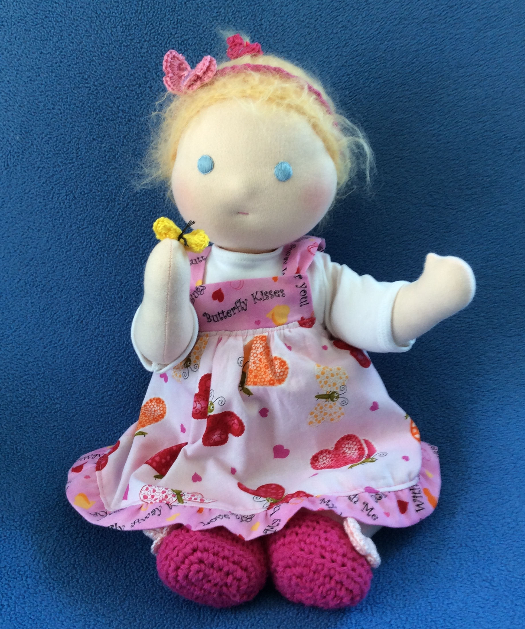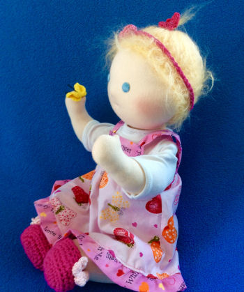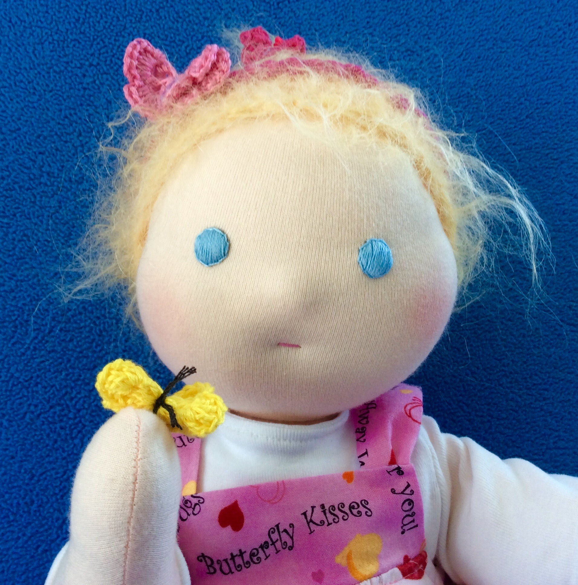 Vanessa's sweet spirit is as soft and gentle as a butterfly's kiss. Her Waldorf-inspired head, face and hair are my original design. Vanessa's face is needle felted wool, covered with 100% cotton knit. I embroidered her eyes and mouth, using 100% cotton floss and crocheted her honey-blonde hair using Wild Brushable Mohair yarn. Vanessa's body is a variation of Estelle Ansley Worrell's 15" Baby Doll, from Dolls, Puppedolls, and Teddy Bears, copyright, 1977.