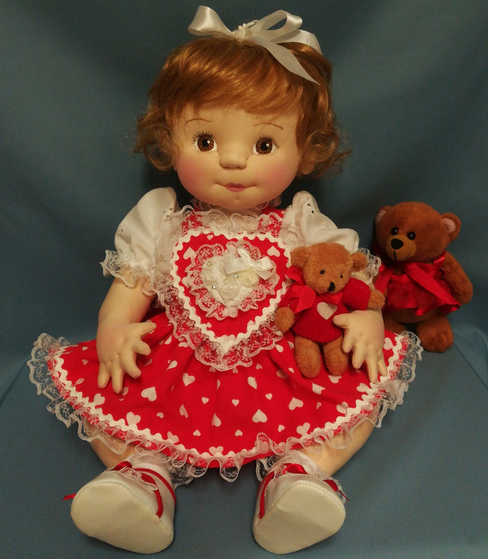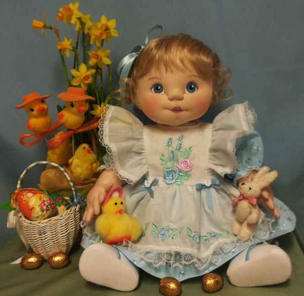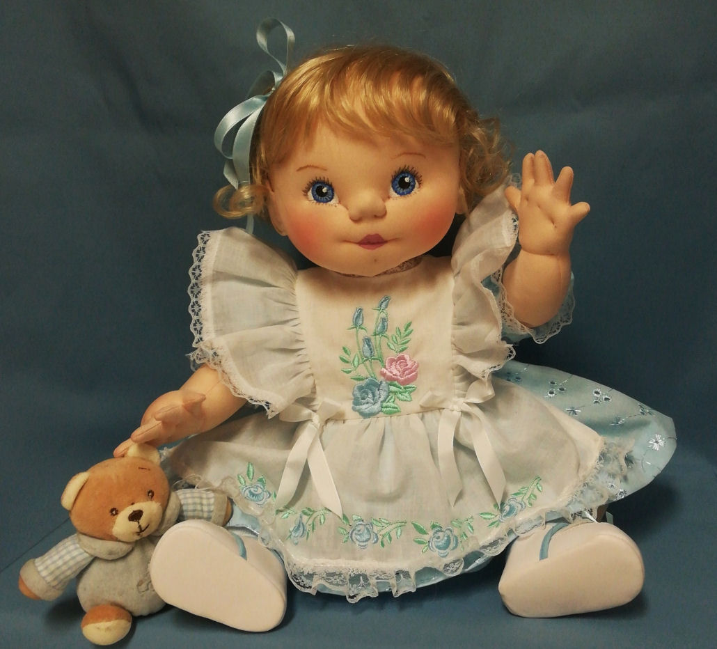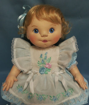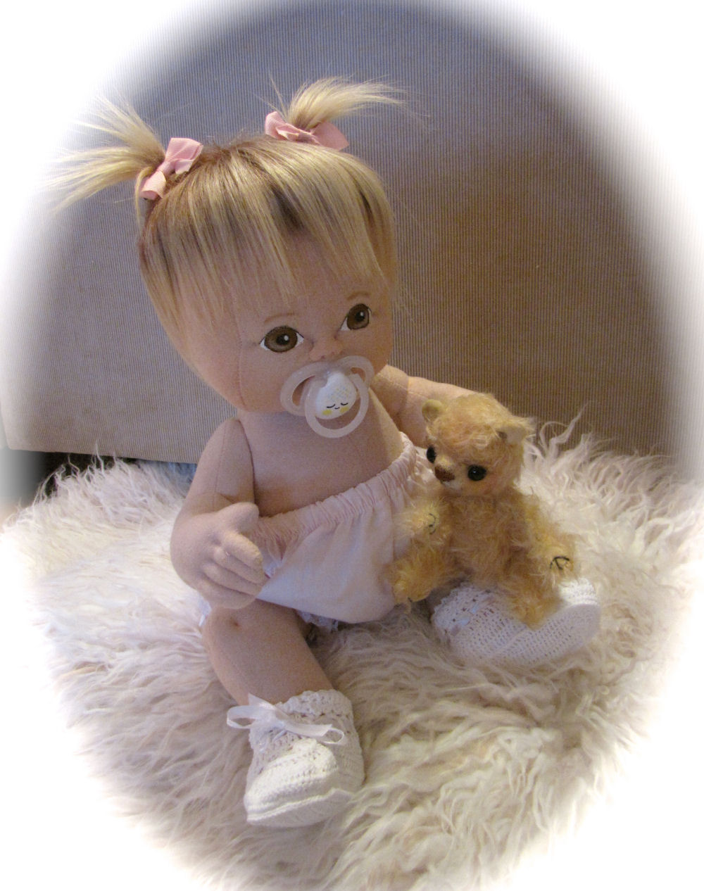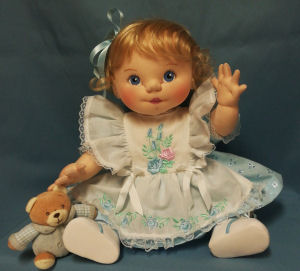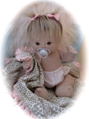 Her body is made of Windsor Comfort fabric and her arms and legs are movable. Since she is 9 months old she can sit on her own. Her face is soft sculptured with dimples and she has Brown Acrylic inset eyes with black eye lashes. Her lips are painted with pink acrylic paint and her cheeks are brushed with red blush. On her little tiny ears she is wearing Pink Crystal Studs.