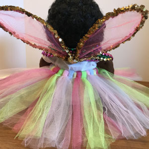 She is wearing a onesie with a Multi-colored TuTu Skirt made of Tulle. For her feet she has on little Pink Ballet Slippers. Attached to her back are Pink & Gold Shiny Fairy Wings and on top of her head is a very beautiful Gold Tiara. Of course, since her theme is Mardi Gras she has around her neck many, many beads.