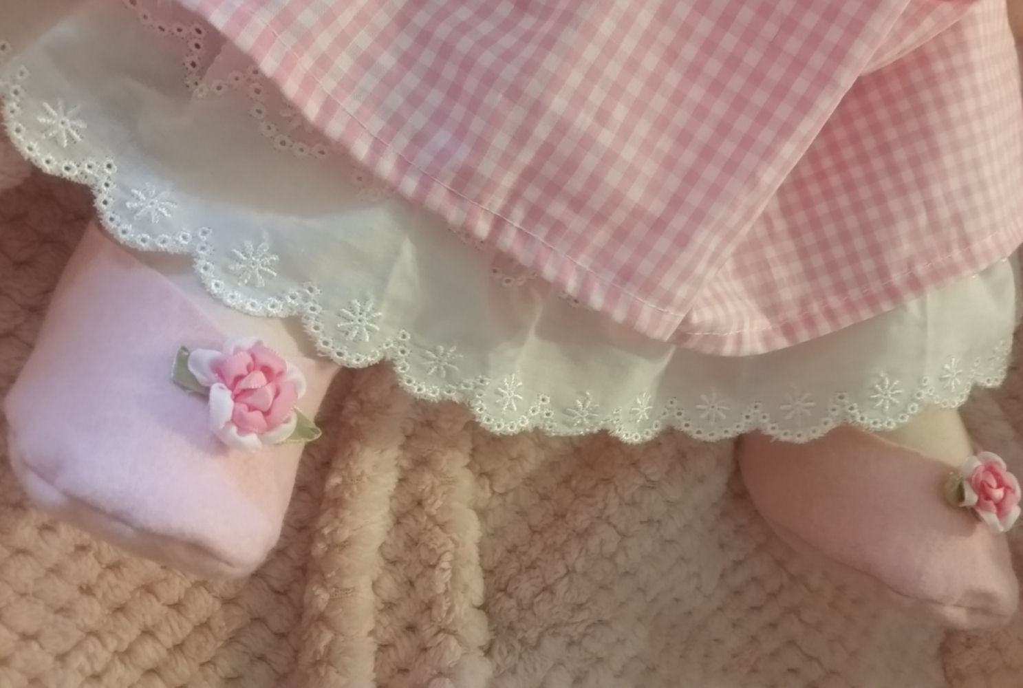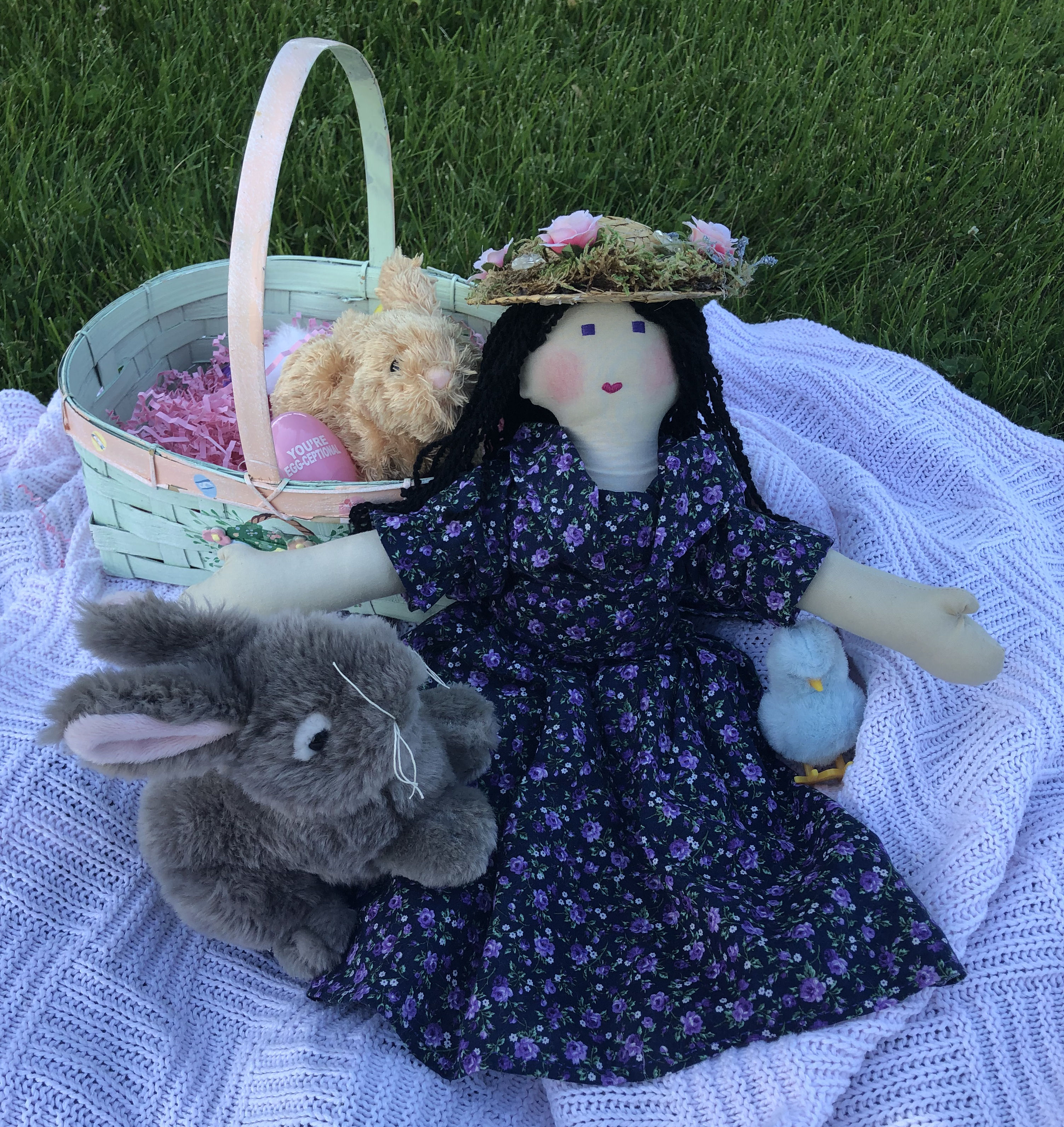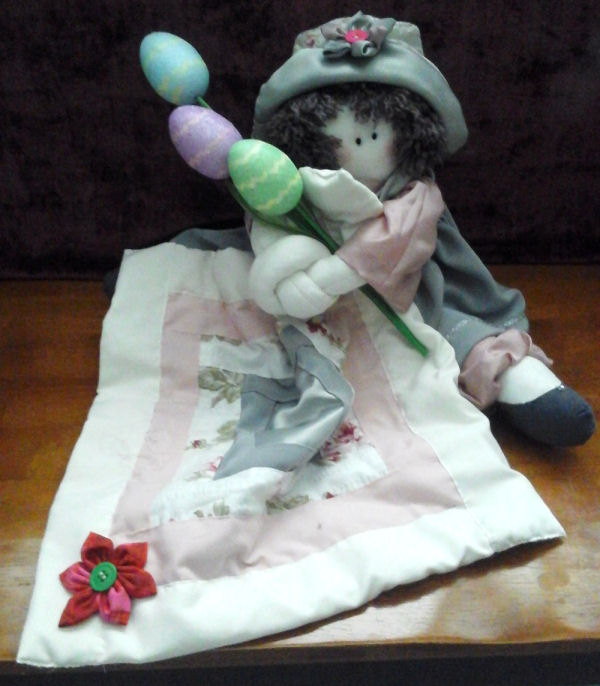 The flowers on Fran's hat and dress are homemade by me. I make cuddle blankets for all my dolls,and add bigger flowers to the blankets. The Easter eggs are store bought.