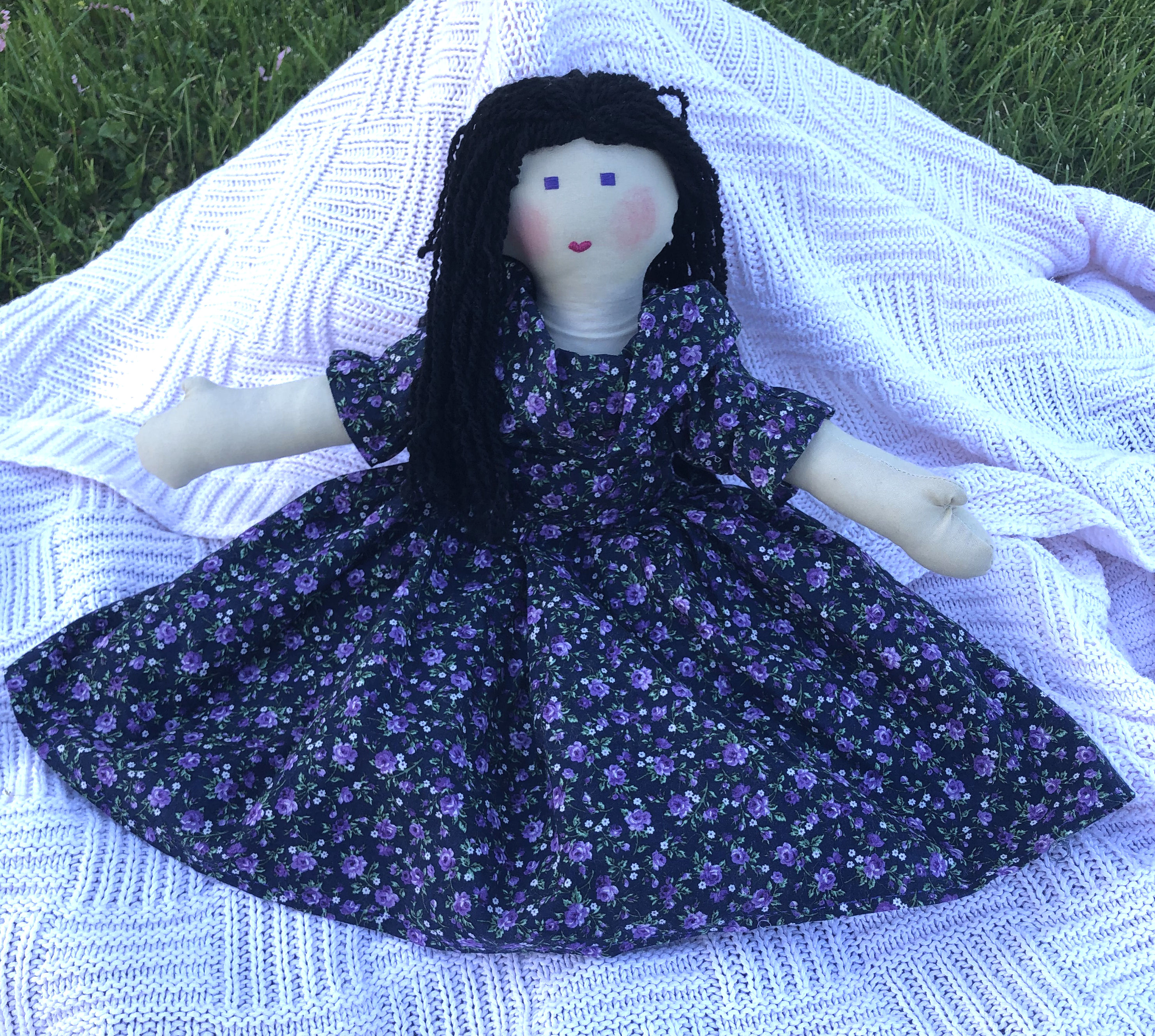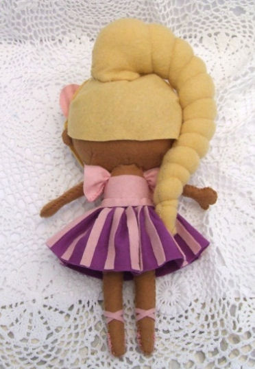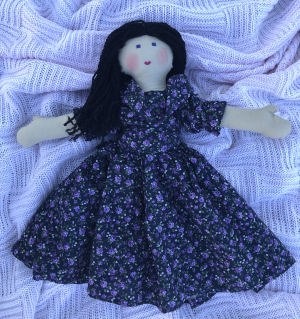 Gabrielle is made with Jodie Davis'™ Fairy Tale Dolls pattern. I wanted Gabrielle to have a unique look, so I gave her purple eyes, plum colored lips and black hair. I individually separated each strand of yarn hair to give it a curly texture. I blushed her cheeks with a colored pencil. I designed and hand sewed her dress without using any pattern.