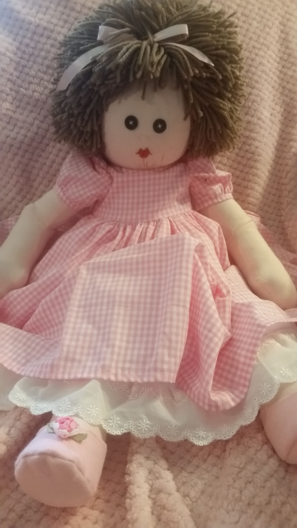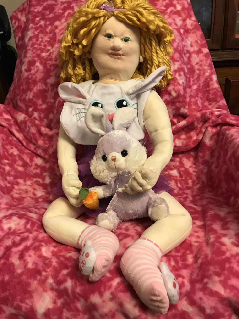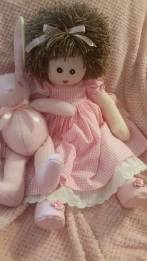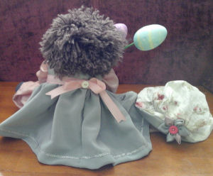 Rebecca is from a 1977 Jenny pattern by Rainie Crawford that has been enlarged. She is 24" tall and is dressed in her handmade very best pink gingham Easter dress with white lace ruffled petticoat and panty. Her handmade pink felt shoes are accented with purchased rosettes. Becca has an embroidered face with button eyes and full head of brown yarn hair with a big pink bow. She is carrying her 14" Easter bunny made from pink fleece adapted from a McCall's bear pattern. She is going on an Easter egg hunt after the party where the kids will get to color eggs.