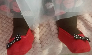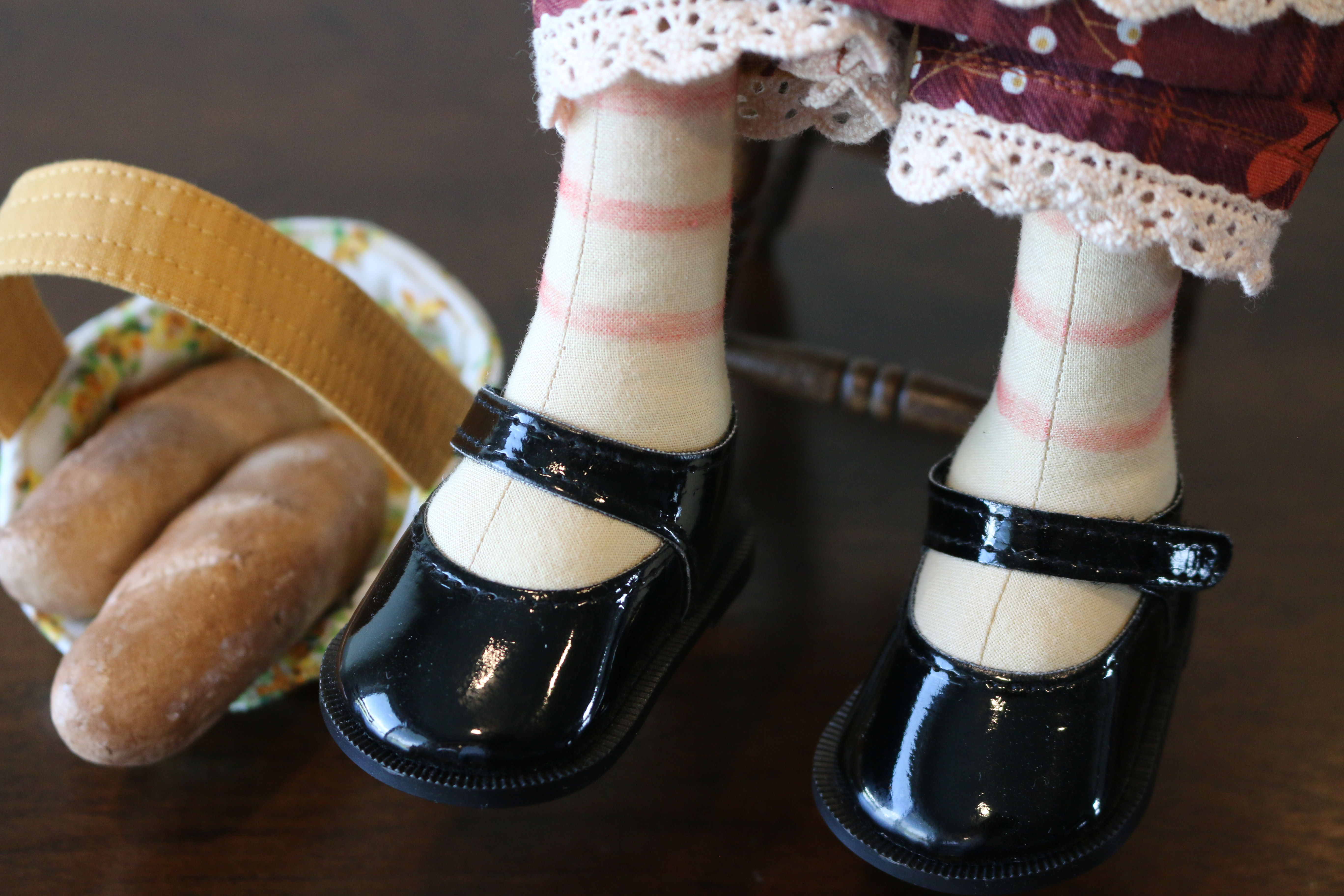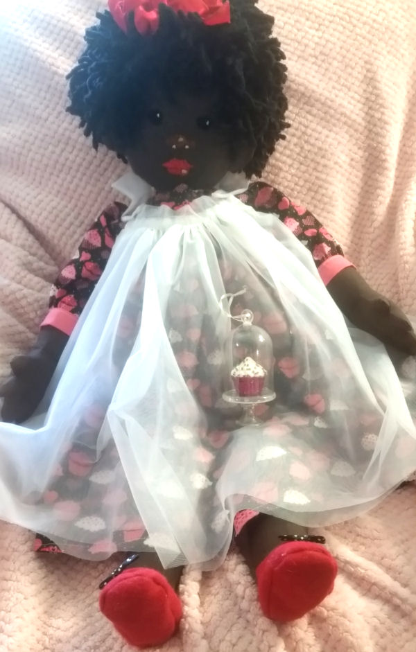 She has black polka dotted bows on her red felt shoes. Her face is embroidered and she has a full head of black yarn hair with a big red bow. Bonnie is carrying a cupcake in a cloche to the party.