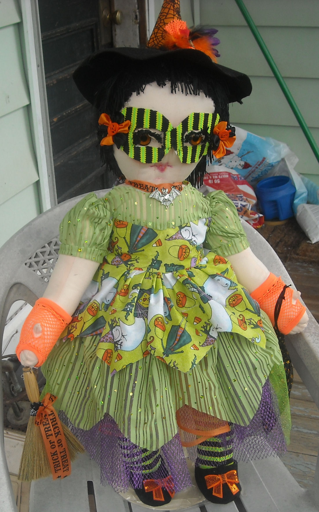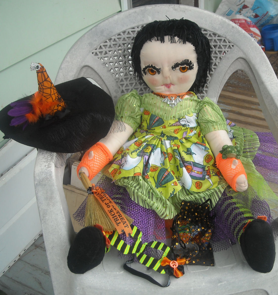 Halloween is my favorite holiday, as you can see, and is a fun time for children to dress up and hope for a bag filled with goodies. Trixie has "cupcakes and candy balls" in her treat bag and her pet frog is sure to help her sort out the goodies. I made the costume for Trixie not her goodies and pet frog which were things I had purchased.
