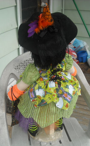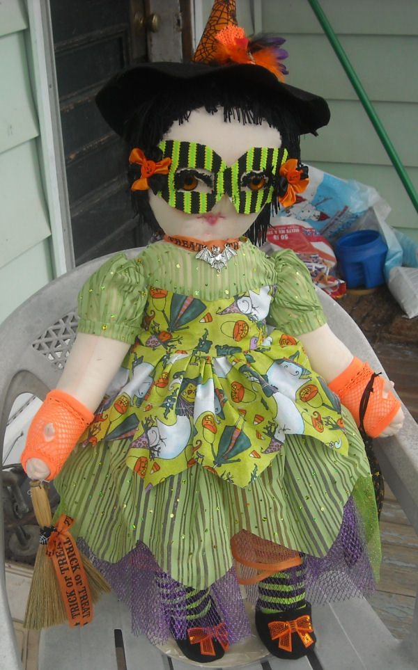 Trixie is 24" tall and was created from a 1950's mail order pattern for a girl doll, given to me by my grandmother many years ago, the wee witch was my idea. The pattern didn't list the designer.