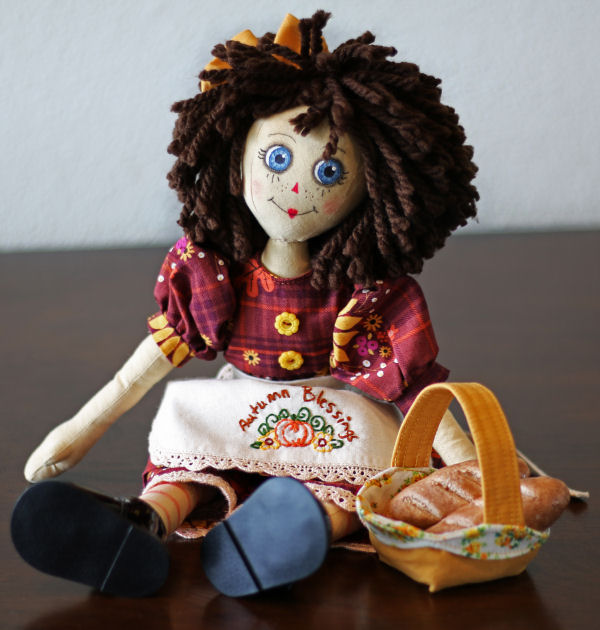 decorations--pumpkins and scarecrows, orange and brown colors, apple cider and cinnamon. I also have a fascination for vintage dolls, like Raggedy Anne. Thus, I created "Thanksgiving Annie."