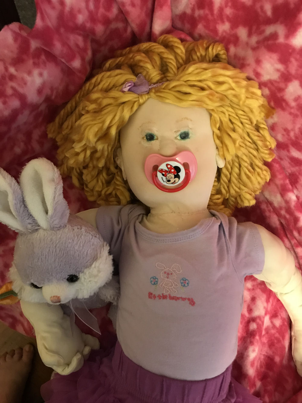 She has a magnet inside her mouth so that her pacifier attaches, Her clothes and socks are store bought. I made her blanket from a soft fleece.