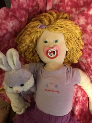 Her skin is made from a soft, knit fabric and she is anatomically correct. She is stuffed with fiber fill and weighted with craft sand. Her hair is made from a soft, thick yarn and her eyes are drawn on with fabric pens. I also used make-up.