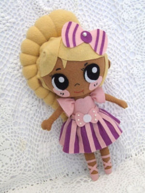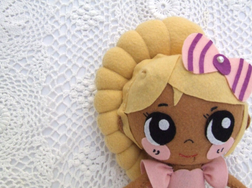 Julie is all made from felt, stitched completely by hand. I have designed the doll and made the pattern pieces to make her. She looks like a Kawaii japanese figure. She stands 12.5" tall.