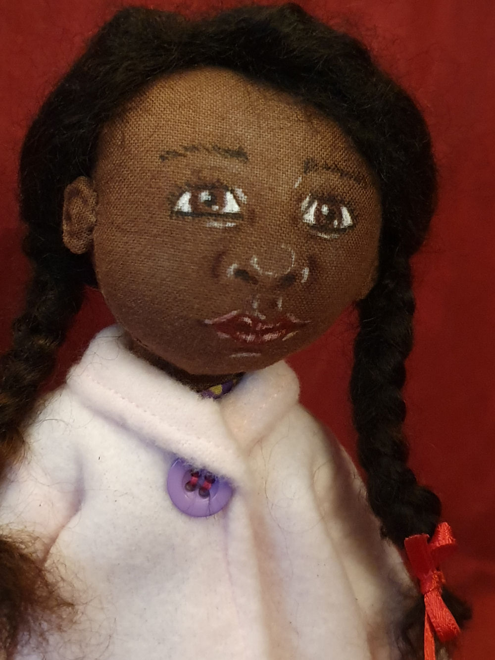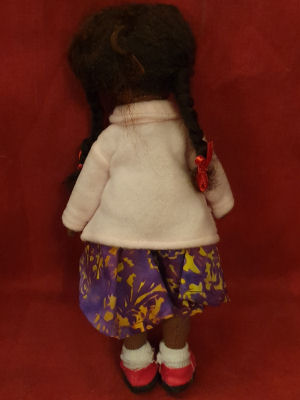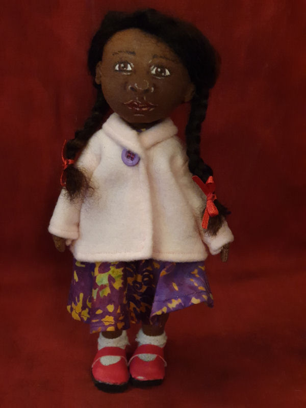 This little girl, whom I've named Jasmine, was made using the basic pattern by Tom Collins. Tom's pattern is just for the doll body. Face, hair and clothing are of my own creation. Jasmine has alpaca hair, wearing a pattern dress, fleece jacket, socks and pink shoes.