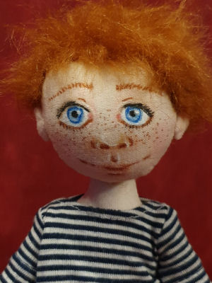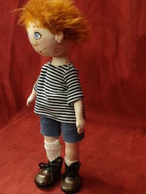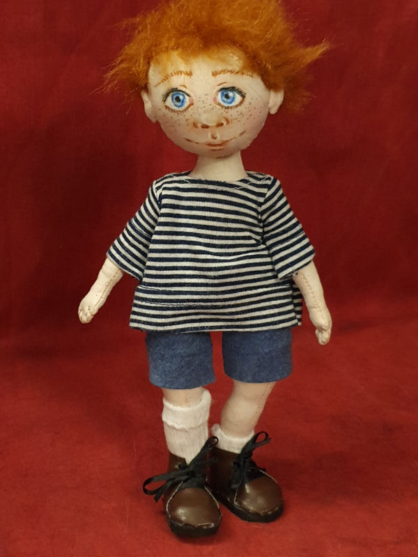 Let me introduce little Tommy. Tommy was made using the pattern by Tom Collins. This pattern is just for the basic body, the face, hair and clothes were my own creation. Tommy is wearing a Jersey top, shorts, socks and leatherette boots. Little Tommy is ready for mischief!