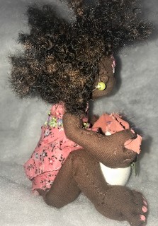 My baby doll's name is Rachael. She is 9 months old. She is living among us during the COVID-19 pandemic. This doll is my first original creation that started with the armature which represents the bones inside the human body. The stuffing used to build the body resembles the cells and muscles within our bodies. The fabric resembles the skin that covers our insides.