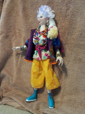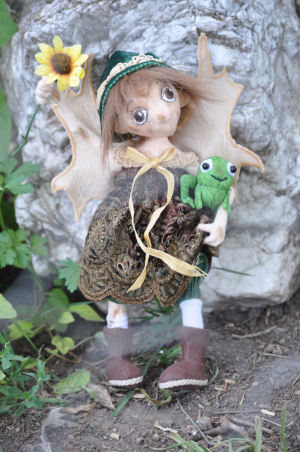 As arthritis continues to stiffen my fingers, I decided my days of making fairies and elves was over, until I spotted Jill Maas's beautiful fairy, Donatella, which is the pattern I used for this doll. She is self-standing, and each wired finger bends. Her frog friend and her clothes are all handmade.