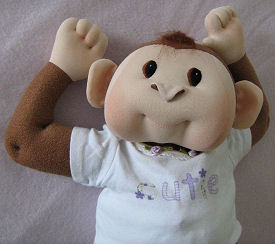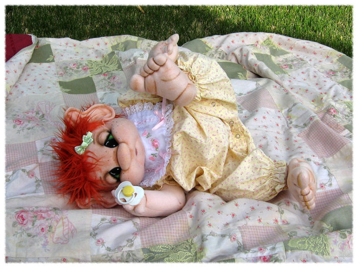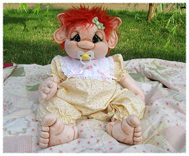 Clementyme is from my own original pattern. I used craft velour for her body and her limbs are cotter pin jointed. Her hair is a faux fur wig I made. She is wearing real baby clothes in the 6-9month size and her feet are way too big for baby shoes lol. You will see her trying to figure out why she cannot wear a pair of toddler shoes in one of her photos.