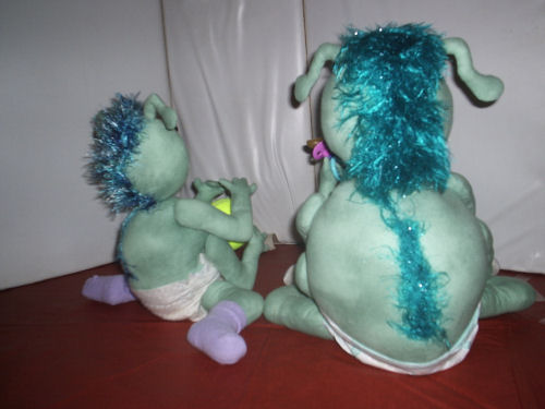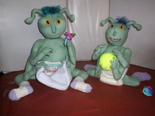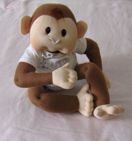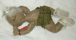 Arnold & Danny are made from cotton - their hair & spine are eyelash yarn that was crocheted - head & arms are jointed.