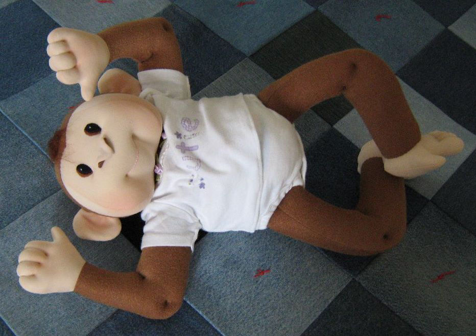 Her outfit was made from a real baby onesie. She also wears a real disposeable diaper.