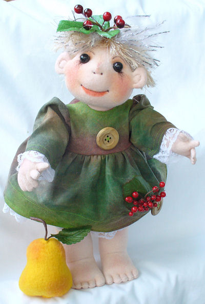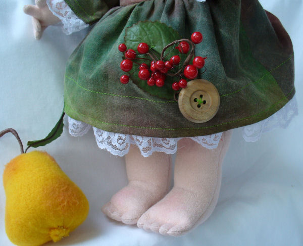This little Troll/Elf/Hedgehog doll with her pear, brought back fond memories of my childhood in Germany. We used to go into the woods weekly to gather wood and we were always aware of the little Forest People and I am sure we saw them many times lol. Trudy (named after my German cousin), is wearing a dress I made out of my hand painted fabric. The fabric looked woodsy to me with all the shades of green. She has berries and leaves in her yarn hair and big buttons and berries on her dress. The face is colored in with crayon, pencil and pen and ink. I couldn’t bear to put shoes on those precious feet.