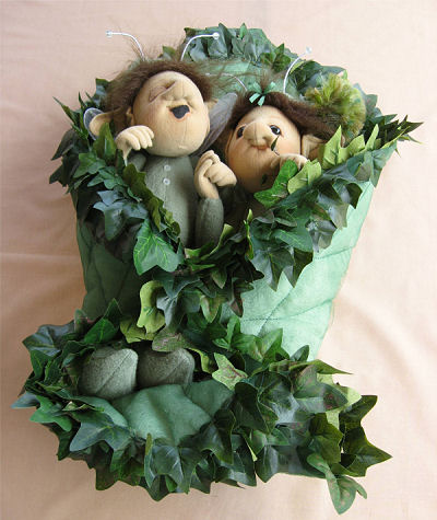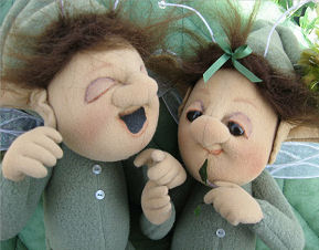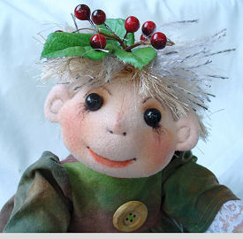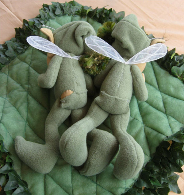 Materials used ~ Doe Suede head & hands & Fleece PJ's with polyester stuffing. Leaf trimmed quilt is green tulle over green EcoFill recycled polyester fibre.