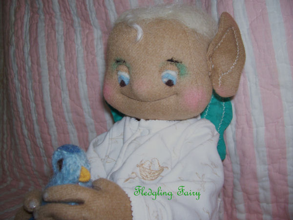 Fledgling Fairy was created from Jennifer Carson's Pea Pod Baby Fairy Pattern. Fledgling is made from "recycled" thrift store fabrics. His body is from a camel hair jacket, his wings from a silk blouse. The "onesie" he is wearing is from the thrift store, as well, and set the theme for his creation as it is patterned with birds and nests. His companion was made from a piece of a sweater sleeve with needle felted embellishment. Fledgling's eyes, eyebrows, and hair are made of needle felted wool.