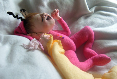 This is Clementyme the abandoned baby giant. She was found in the woods by a carpenter and his wife. Seems, that while the clan of Giants in that region are on the smaller end of the race, some believe at some point in history they mixed with a local troll clan which in turn gave them their smaller size and somewhat pointed ears, they still pride themselves with being Giants so often times the runts born (most times little girls) are abandoned. Clementyme, while only being a week old, has all the motor skills of a human one year old and is wearing 6-9 months clothes.