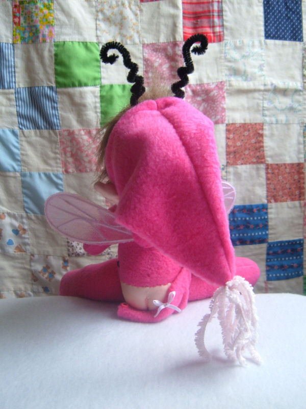 Her name is Snoozie. She is 12" long with her bent legs. Her pattern designer is Shelley Hawkey of Abra Creations. She has been a delight to create. I followed Shelley's pattern, including needle sculpting. I chose to make a little girl. I learned to do things I have never done, work with faux fur, sew on snaps, make the wings. So much fun. I have shown her sitting on the edge of a table since she is a shelf sitter but just so posable and fun she can be placed anywhere. I used tiny pink buttons and snaps on her bum flap so it can be closed. Under her hat, there is a small pink fleece that matches her PJ's over the center of her wings. She does have details in her little mouth, tongue etc.
