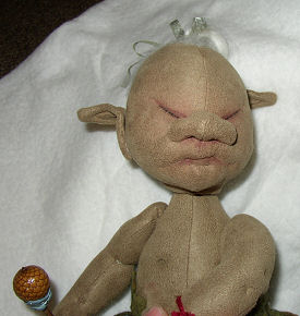 I named my little troll baby "Booboo". This is my first attempt at needle sculpting and I had a lot of fun. I created a little rattle using a seed pod from a potpourri mix and polymer clay. I fashioned the diaper from a picture of a fig leaf using wool felt. The diaper is stuffed with moss for absorbency, just in case Booboo decides to let loose. The little head is weighted so needs to be supported just like a human baby.