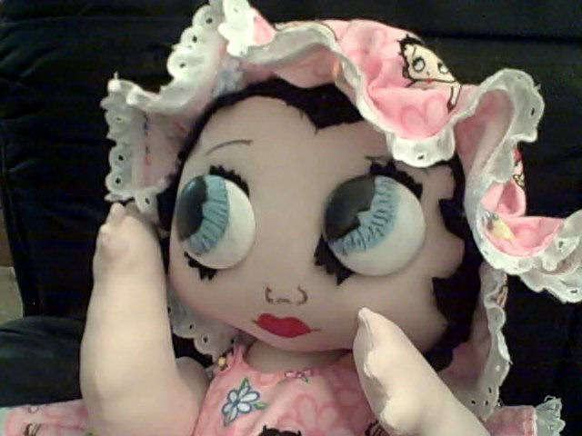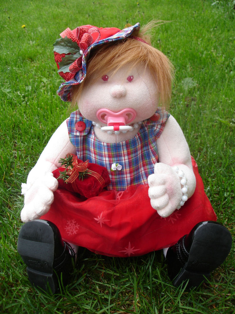 Me...am Baby Princy. Am made of craft velour. Mommy made my face from a Dinky baby pattern while the rest of me are her own design. Even my hat, dress and the little gift. They all fit so perfectly..like its made just for me. Ain't I cute? Am 15" tall. I sit well and if you teach me to stand up, I CAN. I have a christmas gift for Adrian. Am going to his house now for the party. Bub bye
