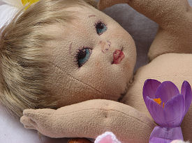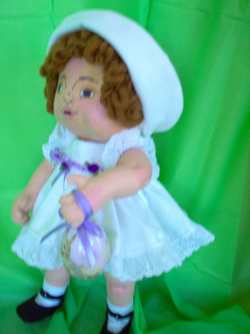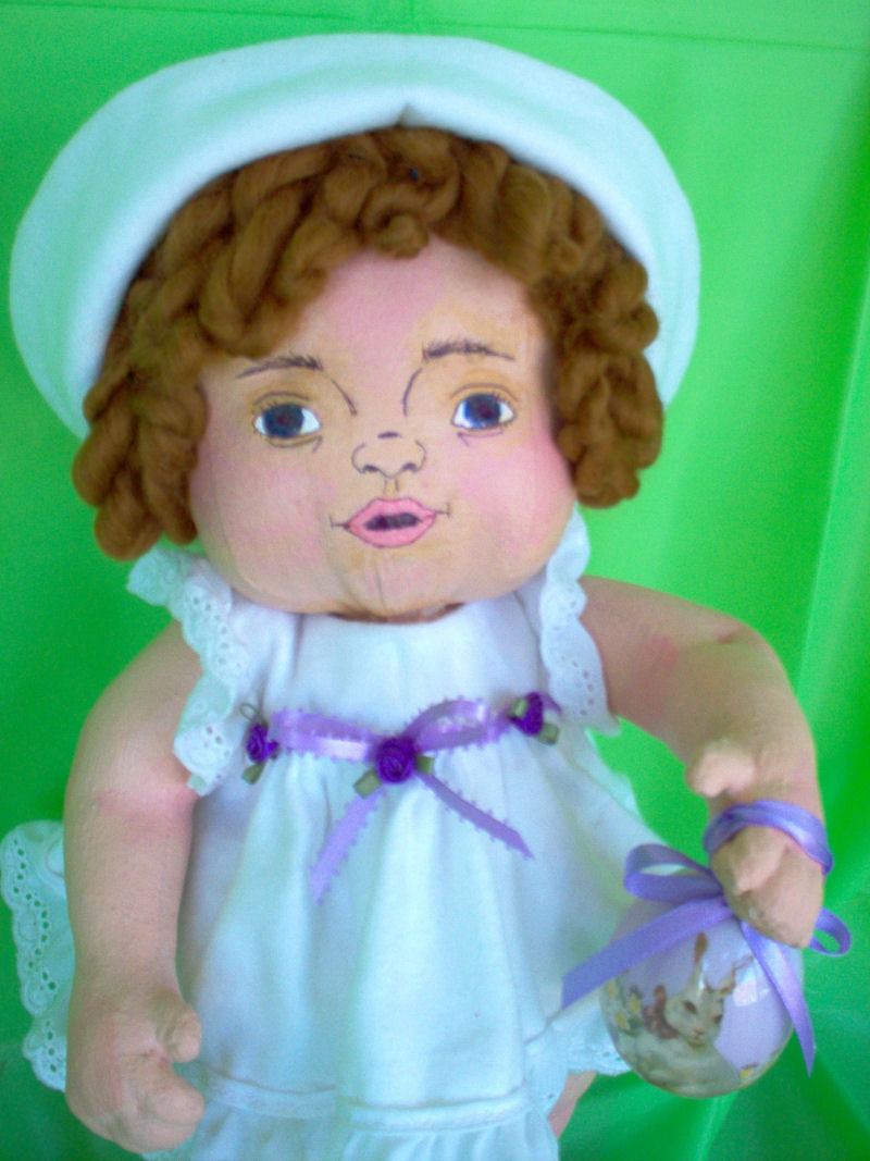 This is baby, Kelly's first Easter, so she is holding a little Easter bunny. The dress and bunny belonged to my granddaughter for her first Easter. This is my first attempt at face painting on a baby doll.