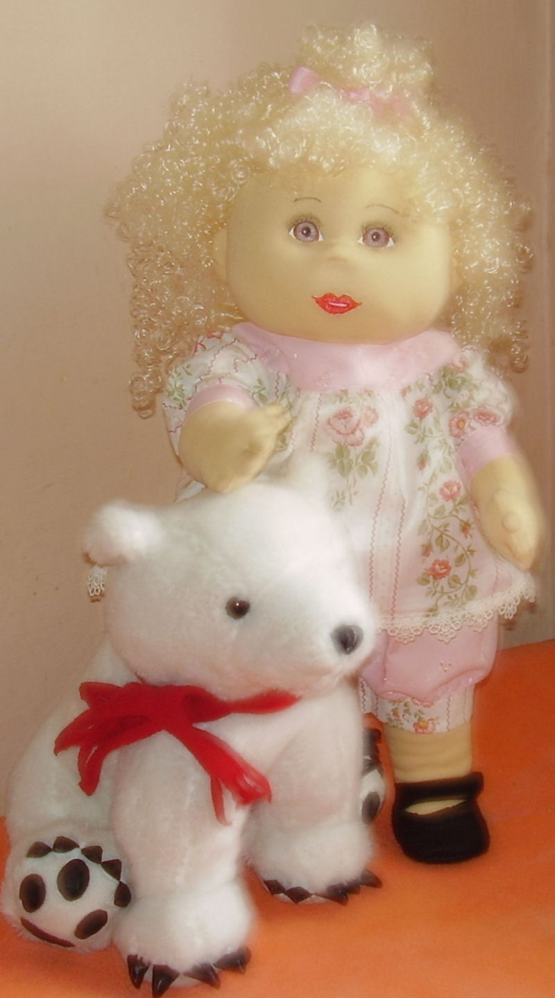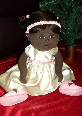 Independence, was born on the 4th of July, so we decided to celebrate this great holiday. Independence was made out of craft velour from a Judi Ward's 6-9 month size baby which includes a swivel head and button jointed arms and legs. She sits very well and looks so real when she is laying down. I used gel pens to get her expression on her face. Independence's outfit was made from an infant Simplicity pattern consisting of dress, pinafore and boomers. She loves celebrating this great holiday by waving the American flag and playing with her patriotic teddy bear, Liberty.