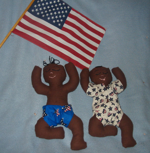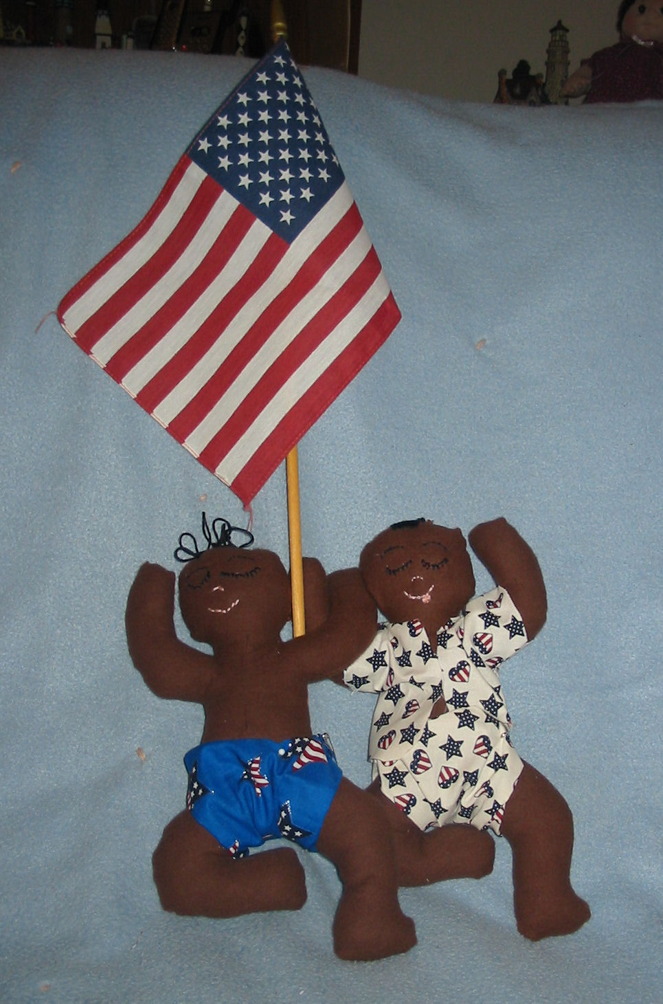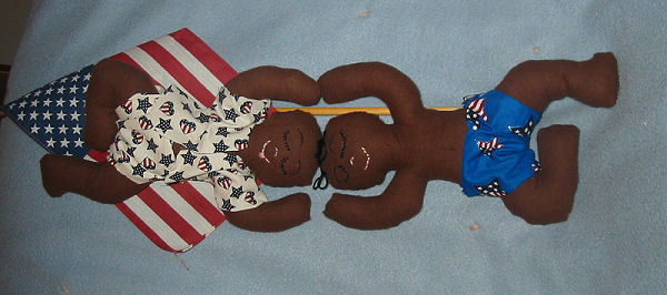 Rocky and Jo Jo are fraternal twins. Rocky is named after "Rocky Balboa" a very patriotic American. Jo-Jo is his sister and she is sleeping with her tongue sticking out because she is a little trouble maker and is even mischievous in her sleep. They are made from a Dolly Hugs pattern designed by Antonette Cely and their skin is made from a soft brown flannel. Their clothes are handmade from a homemade pattern.