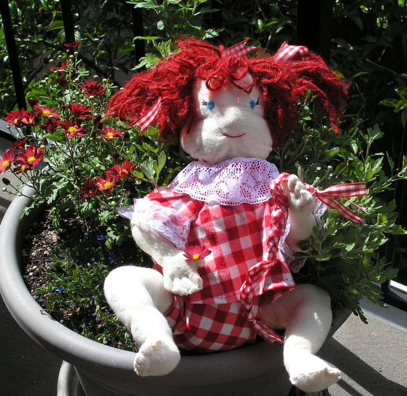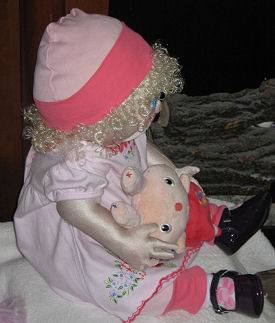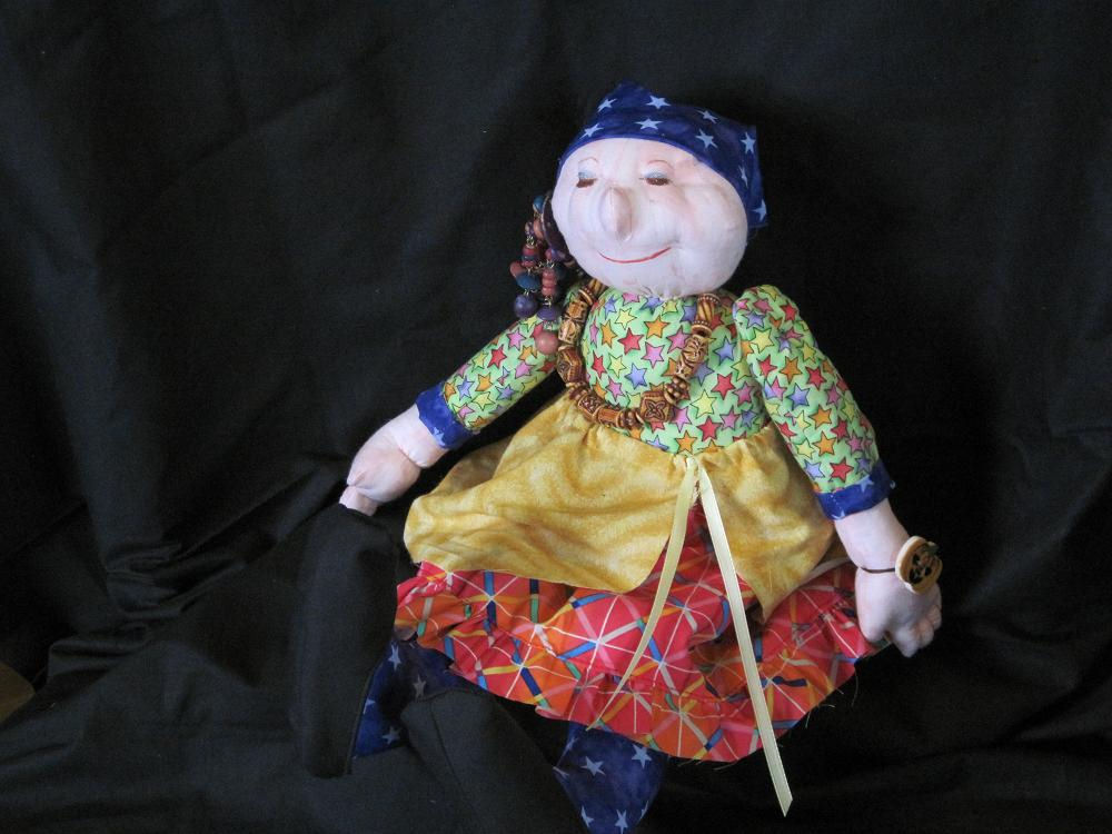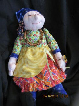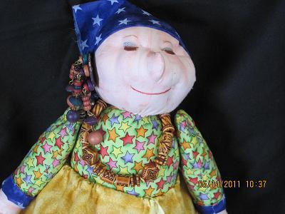 I altered the basic doll by redoing the head because it had printed on face features and hair. I prefer to embroider the facial features and make yarn hair. For the clothing, I decided on a Halloween theme. The dress is made from recycling one of my t-shirts. The knickers are made from the novelty boxer shorts my hubby never wore. The boots are from a soft, dark green leather that started out as a pair of ladies leather pants. Becky stands 16 3/4 inches tall.
