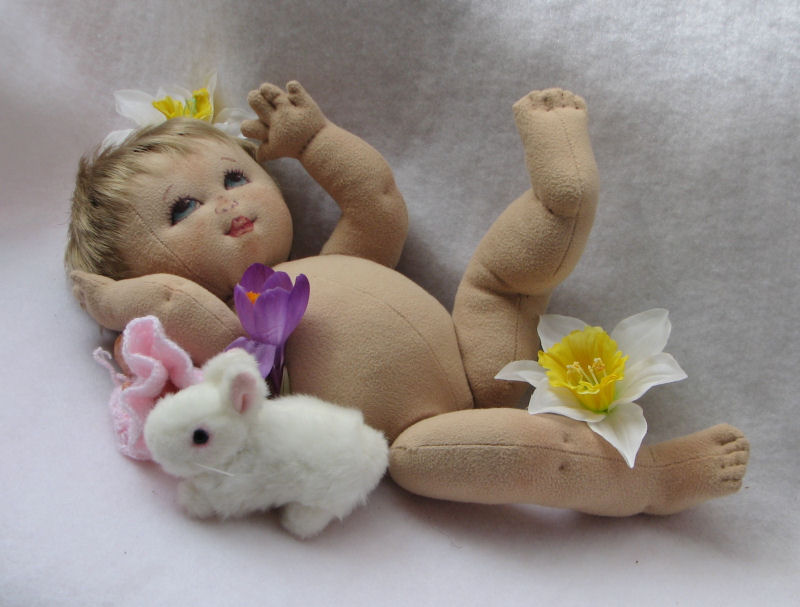 Baby Anne is a spring baby, made from doe suede, stuffed with sheep's roving and weighted with doll beads. Anne's features are painted using a fine-tip marker, the eye's highlights is a toothpick's touch of white-out.